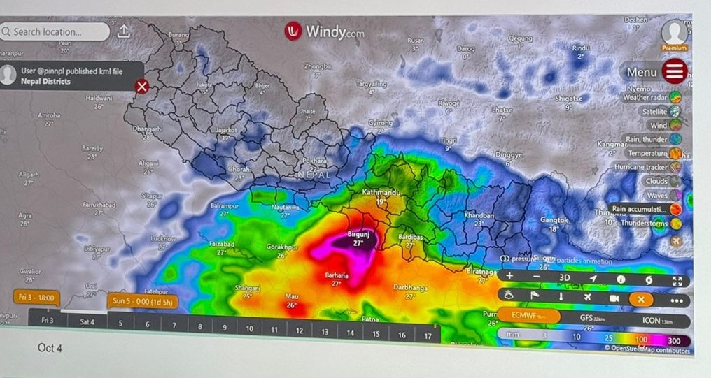 ‘अहिलेसम्म वर्षाले खतराको तह पार गरिसकेको त छैन तर त्यसको नजिक छ,’ पराजुलीले भने । विभागका अनुसार सुनसरी, उदयपुर, सप्तरी, सिरहा, धनुषा, महोत्तरी, सर्लाही, रौतहट, बारा, पर्सा, सिन्धुली, दोलखा, रामेछाप, सिन्धुपाल्चोक, काभ्रे लगायतका जिल्लामा बाढीको अति उच्च जोखिम छ ।